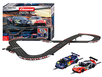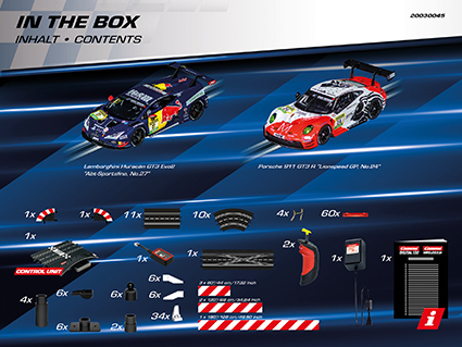Vollgas und Nervenkitzel in jeder Kurve Mit dem Carrera DIGITAL 132 Set Full Throttle tauchen Racing-Fans direkt in die Welt des Motorsports ein. Die packenden Duelle starten mit zwei legendären Boliden: Der Porsche 911 GT3 R Lionspeed GP, No.24 besticht durch seine herausragende Agilität und Leistungsfähigkeit, während der Lamborghini Huracßn GT3 Evo 2 Abt-Sportsline, No.27 mit seinem markanten Design und beeindruckendem Speed überzeugt. Beide Fahrzeuge sind detailgetreu im Maßstab 1:32 nachgebildet und bringen mit Front-, Rück- und Bremslichtern echtes Rennstrecken-Feeling ins Wohnzimmer. Mit innovativen Funktionen wie Ghost- und Safetycar, werden strategische Elemente in das Rennen eingeführt und sorgen für intensive Rennaction und spannende Überholmanöver. Der Fullspeed-Modus lässt die Fans den Nervenkitzel auf den Highspeed-Geraden förmlich spüren. Hier ist Racing-Feeling der Extraklasse angesagt.