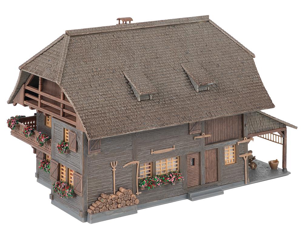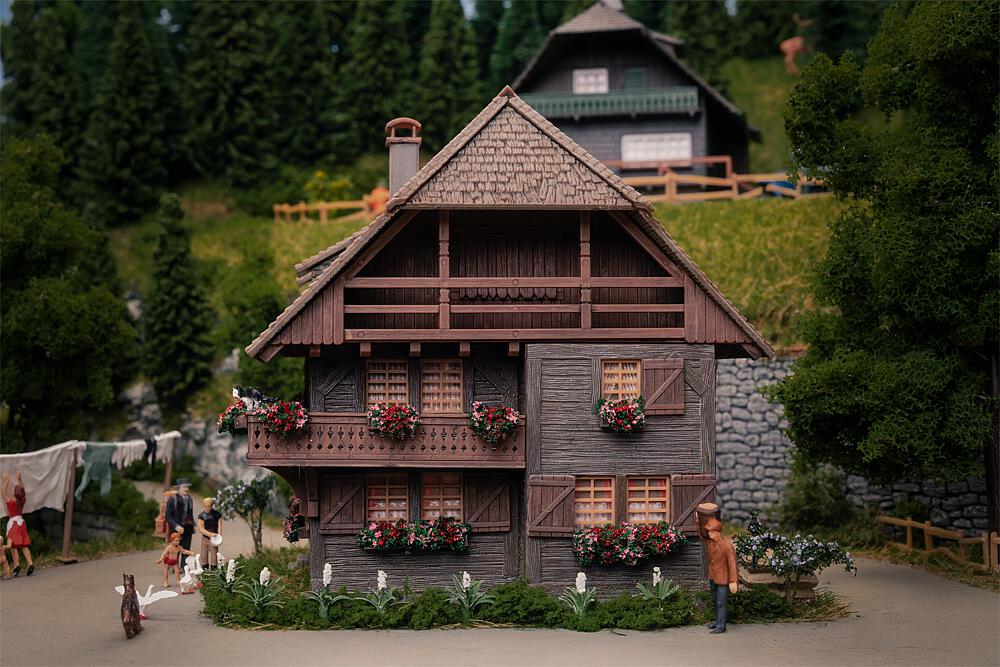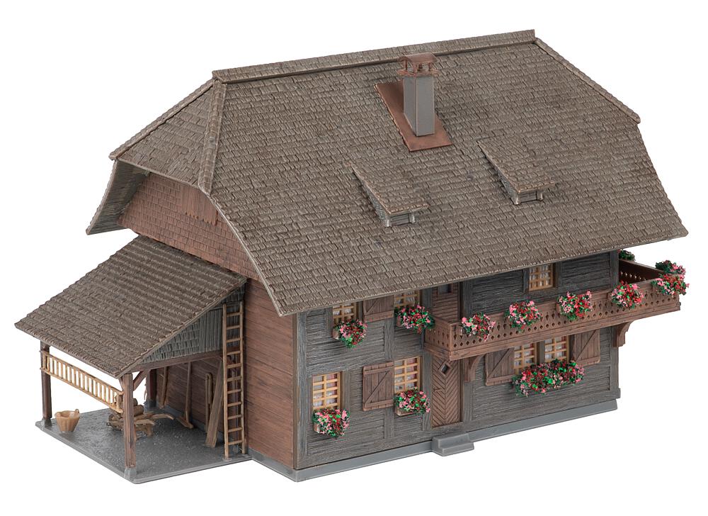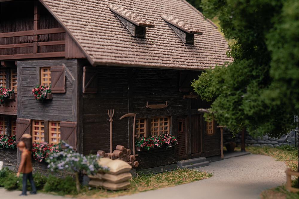 Anlässlich unseres 80-jährigen Jubiläums rückt unsere Heimat – der Schwarzwald – in den Fokus unserer Modellwelt. Was uns seit jeher inspiriert, wird für ein Jahr besonders sichtbar: Die Kunst des Modellbaus, verwurzelt im Schwarzwald! Ein charmantes, dunkles Schwarzwaldhaus, wie man es in den Höhenlagen des Schwarzwaldes findet. Blumenkästen in leuchtenden Farben schmücken die Fassade und verleihen dem Gebäude eine heimische Ausstrahlung. Dank seiner dezenten Größe fügt sich das Haus perfekt in Wiesen- und Waldlandschaften ein und eignet sich ideal für den Anlagenhintergrund. Inklusive Figur, einem Uhrenträger – ein kleines Stück Schwarzwälder Tradition für jede Modellwelt.