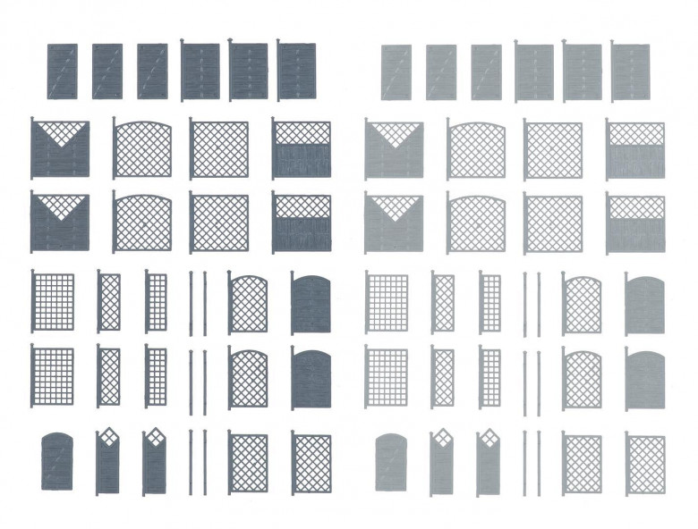 Fein gearbeiteter Sichtschutzzaun in hellem und dunklem Grau, ideal zur realistischen Ausgestaltung von Gärten, Vorgärten und Hausumrandungen. Ob modern oder klassisch – sie fügen sich dezent in jede Szene ein.