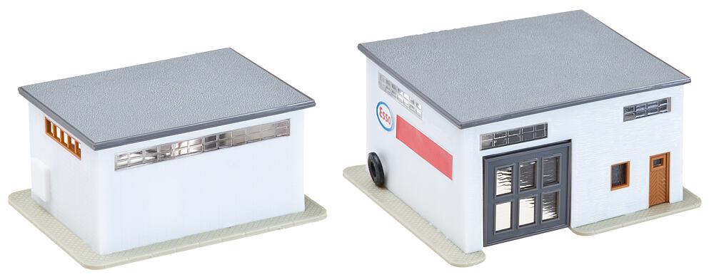 Tankstelle mit Waschhalle: Modern gestaltetes Ensemble, bestehend aus Tankstelle mit überdachten Zapfsäulen und angeschlossenem Kassenraum sowie einer separaten Waschhalle. Zum Zubehör gehören verschiedene Werbeschilder, Zapfsäulen, eine Reifen-Auslage sowie ein Schlauchaufroller. Ideal geeignet zur Ausgestaltung von Stadt- und Dorfszenen und als belebter Mittelpunkt für Straßenverkehr auf der Modellbahnanlage.