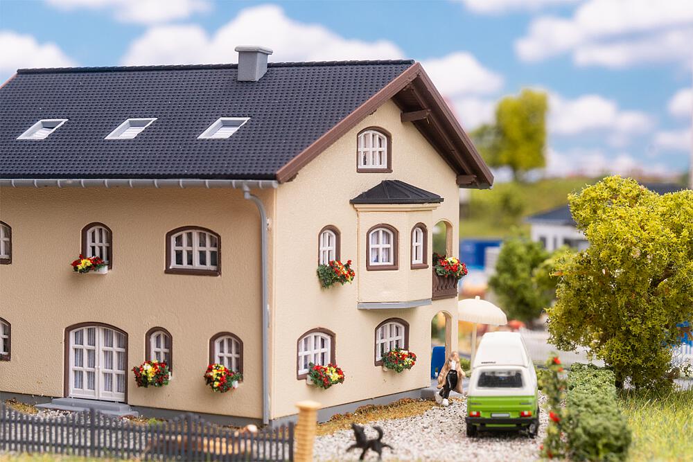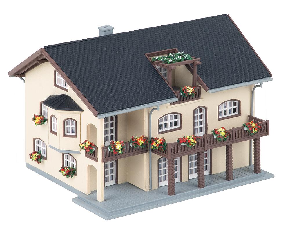 Das helle, moderne Wohnhaus mit Erker, Balkonen, überdachter Terrasse und innenliegendem Dachbalkon sowie bunten Blumenkästen bringt Ruhe und lebendige Details in jede Miniatur-Wohngegend.