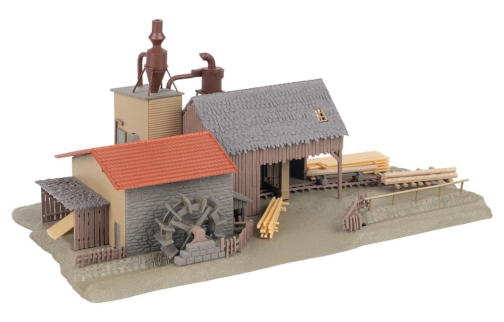 Dieses liebevoll gestaltete Sägewerk besticht durch zahlreiche feine Details und ein authentisches rustikales Erscheinungsbild. Das Wasserrad kann durch den Einbau des Motors (Art. 180629) angetrieben werden, wobei der Einbau nur während der Montage des Bausatzes möglich ist. Bitte beachten: Der Motor ist nicht im Lieferumfang enthalten.