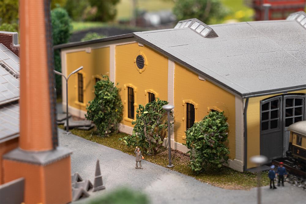 Dampf zischt aus einer alten Lok und der eifrige Bahnbetrieb rund um den Lokschuppen erweckt das Miniaturmodell zum Leben. Der beeindruckende 5-ständige Ringlokschuppen »Freilassing« mit seinen Dachreitern und detailverliebten Seiten- und Rückfenstern ist eine Anlehnung an das denkmalgeschützte Original in Freilassing in Bayern. Dieses ist heutzutage der Sitz eines Eisenbahnmuseums (lokwelt.freilassing.de) und damit eine interessante Ergänzung für alle Modellbau- und Eisenbahn-Begeisterten. Die Formneuheit aus Kunststoff hat eine Teilung von 15 Grad. Lokomotiven können bis zu einer Länge von 120 mm problemlos einfahren.
