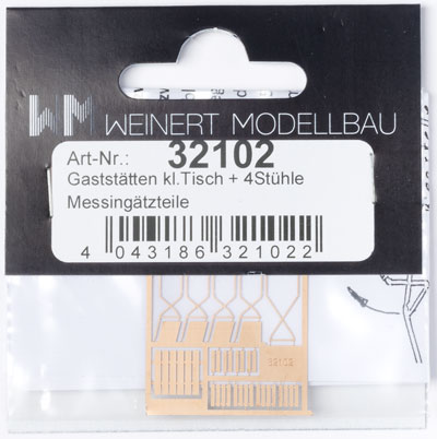 Weinert H0 Bausatz Gaststätten kleiner Tisch + 4 Stühle. Bausatz aus Messingätzteilen, unlackiert. Schwierigkeitsgrad: Fortgeschrittene.